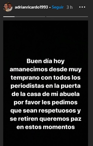“Buen día. Hoy amanecimos desde muy temprano con todos los periodistas en la puerta de la casa de mi abuela. Por favor, les pedimos que sean respetuosos y se retiren queremos paz en estos momentos”.