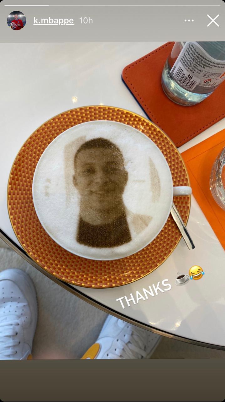 Esta mañana, Mbappé utilizó su cuenta de Instagram para mostrar su figura en la taza de café que es realizada mediante una impresora que utiliza colorante comestible; el jugador escribió: "¡Gracias!", acompañado de un emoji de risa y otro de una taza de café.