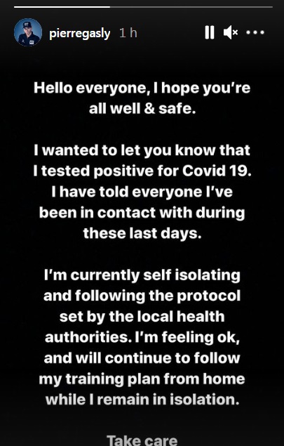El piloto francés Pierre Gasly, competidor del equipo AlphaTauri, resultó positivo por covid-19, según se informó este domingo.