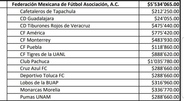 En México, 13 equipos se vieron beneficiados por el pago de este bono, siendo los Tuzos del Pachuca los que más dinero recibieron con un millón 35 mil 780 dólares.