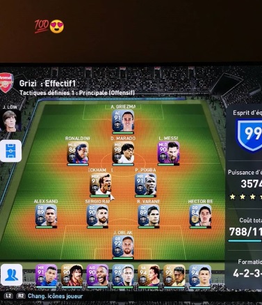 Grizi comanda su delantera seguido de un tridente que haría temblar a cualquier arquero, Ronaldinho, Diego Maradona y Lionel Messi, en el medio campo está David Beckham y Paul Pogba, amigo y compañero de Griezmann en la selección francesa.