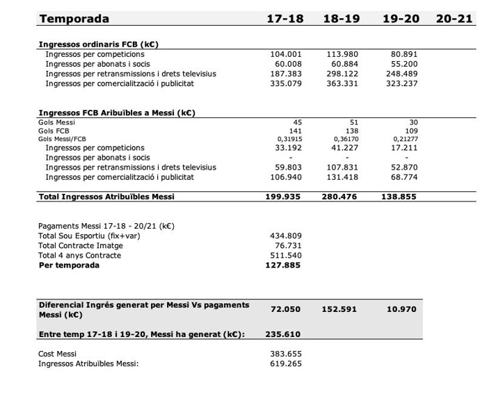 Ciria i Roig calculó lo generado por Messi las pasadas tres temporadas y lo comparó con los ingresos del FC Barcelona. Los ingresos atribuibles al jugador suman 619.265 millones euros (15 mil 195 millones 400 mil pesos mexicanos) Es decir, si en los primeros años del contrato se le pagó a Leo 383,655 millones, él ha dejado una ganancia de 235.610 millones de euros.