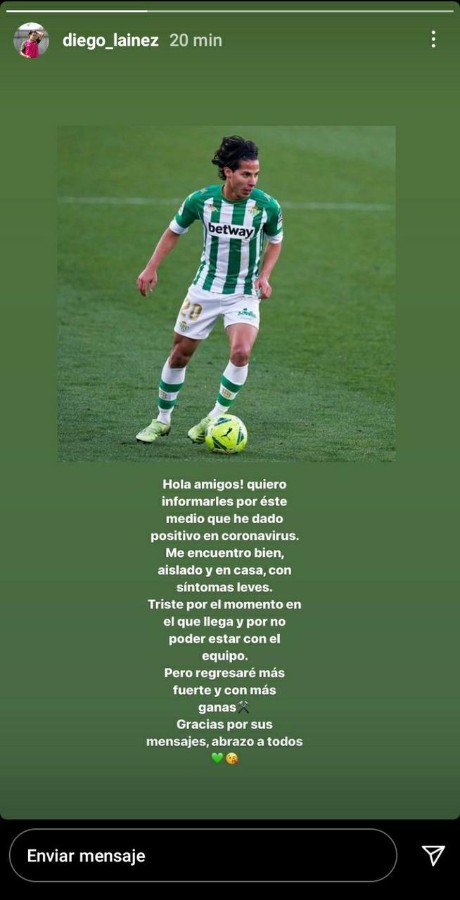 "Hola amigos, quiero informarles por este medio de que he dado positivo en coronavirus. Me encuentro bien, aislado y en casa, con síntomas leves. Triste por el momento en el que llega y por no poder estar con el equipo. Pero regresaré más fuerte y con ganas", colocó Lainez.