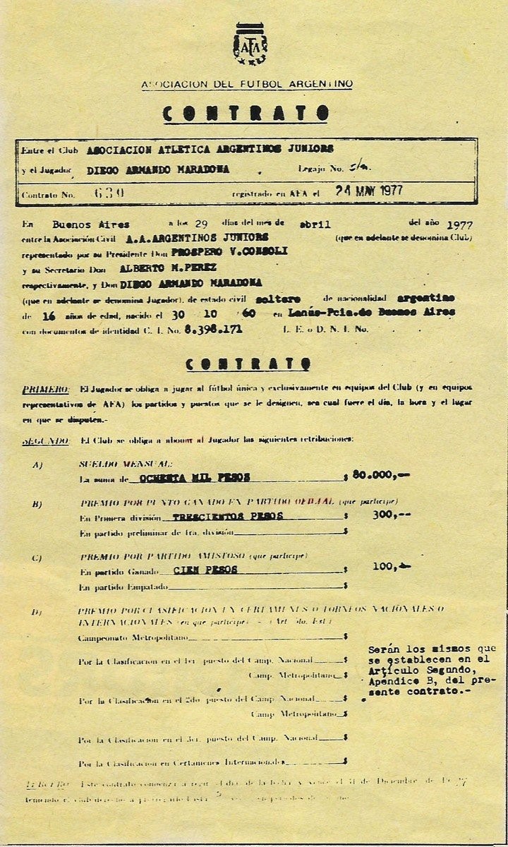 Diego Maradona con el paso de los años se convirtió en una estrella mundial del futbol y ganó millones; sin embargo, como todo futbolista tuvo que pasar por varios contratos antes de eso. El primero de todos que firmó el astro fue con Argentinos Juniors.