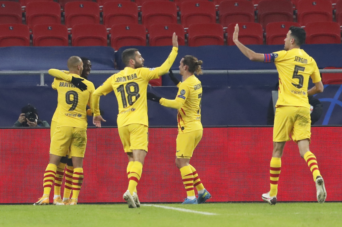 Antoine Griezmann abrió el festival azulgrana de espuela (14), Martin Braithwaite amplió la cuenta (21) y Ousmane Dembélé puso el 3-0 de penal (28) certificando la quinta victoria del Barça en cinco partidos de Champions.