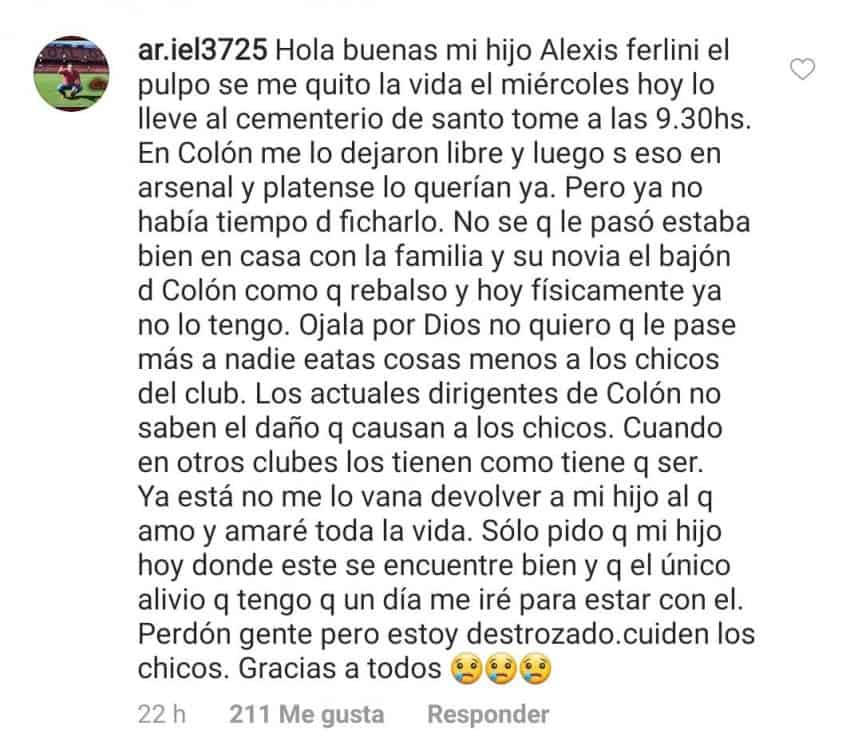 "Mi hijo Alexis Ferlini, el Pulpo, se me quitó la vida el miércoles. Hoy lo llevé al cementerio de Santo Tomé a las 9:30. En Colón me lo dejaron libre y luego de eso, en Arsenal y Platense lo querían, pero no había tiempo de ficharlo”, expresó su padre con profunda tristeza en su cuenta de Facebook.