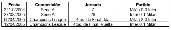 En la temporada 2004-2005, fueron cuatro encuentros entre ambos clubes. Los rossoneros tuvieron marca de tres triunfos y un empate, además de haber blanqueado a los narazzurri.