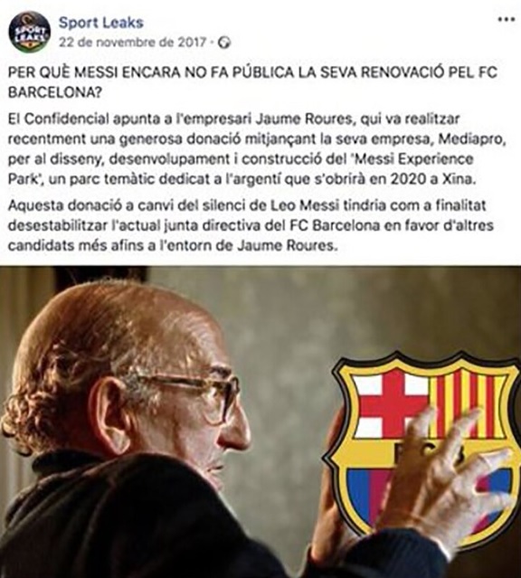 Lionel Messi, máximo delantero del Barcelona, fue uno de los futbolistas afectados. Sports Leaks, una página de Facebook, publicó en 2017 una noticia falsa en la que señalaba al argentino de no querer renovar con el cuadro blaugrana a petición de Jaume Roures, quien le prometió un parque de diversiones.