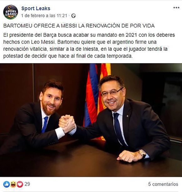 La misma página publicó en febrero que el presidente del Barcelona, Josep Maria Bartomeu, le había ofrecido un contrato de por vida al rosarino y éste se negaba; la intención del post, hacer que los aficionados blaugranas se enfadaran con el camiseta 10.