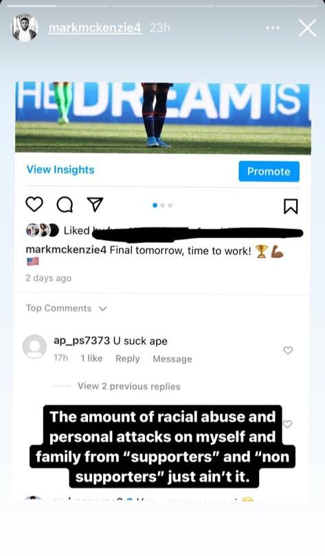 “La cantidad de insultos racistas y ataques personales dirigidos a mí y a mi familia por parte de ‘simpatizantes’ y ‘no simpatizantes’ es inaceptable", escribió McKenzie, de raza negra, en su cuenta de Instagram Stories la noche del lunes.