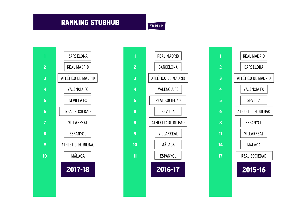 Tras dos temporadas en las que Real Madrid fue el conjunto que más boletos vendió en StubHub, en el torneo pasado, la primera posición de este ranking cambió de dueño. El Barça se situó como el equipo que mayor número de boletos vendió para sus partidos de La Liga Española seguido de Real Madrid, Atlético de Madrid y Valencia, curiosamente los cuatro equipos que lograron el pase para la Champions League.