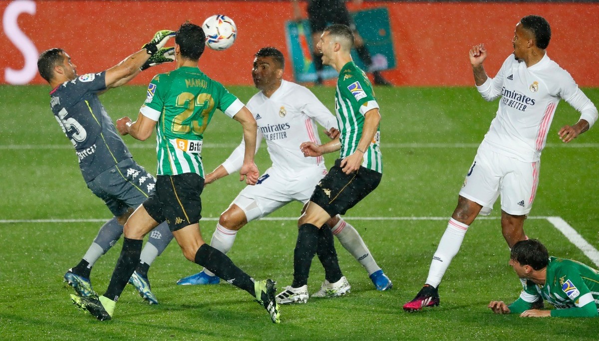 Solo quedaba un recurso al que amarrarse, el regreso de Eden Hazard con más finura que cuando recayó de sus lesiones. Impuso el criterio que faltaba pero bajo la lluvia no hubo remates a su imaginación. A balón parado lo intentó todo el partido el Real Madrid sin éxito y acabó pidiendo mano, de Miranda, tras un remate de Militao. El Betis dio por bueno el punto. Cuarta visita consecutiva a la casa blanca sin salir derrotado y un paso atrás de los de Zidane, al límite de fuerzas.