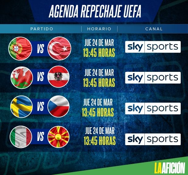 Todo los partidos de las semifinales de la repesca europea serán a través de la señal de Sky Sports, cadena deportiva que cuenta con los derechos de transmisión de las eliminatorias europeas.
