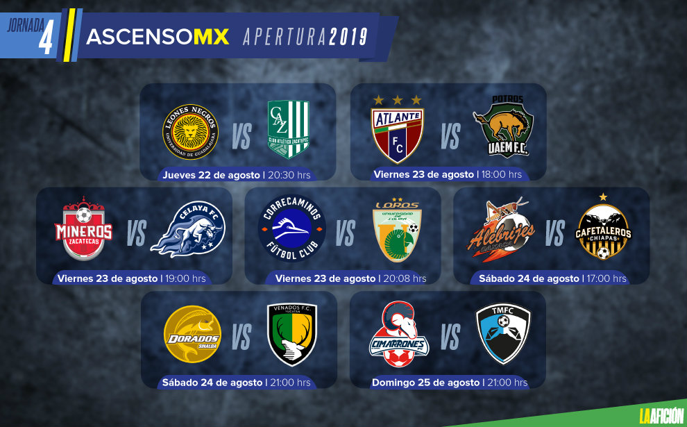 Este jueves 22 de agosto arranca la cuarta semana de actividades en la Liga de Ascenso, por ello te traemos todos los detalles de esta jornada para que no pierdas pista de tu equipo.