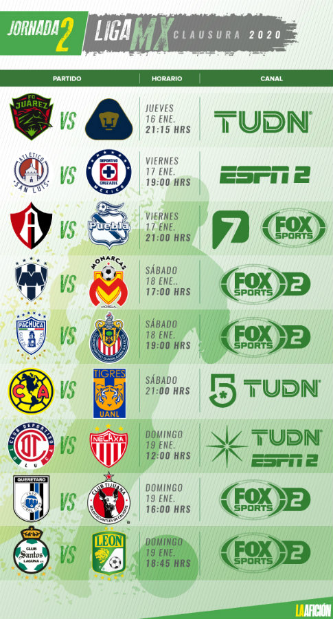 Arranca la segunda Jornada del Clausura 2020 en la Liga MX por lo que te dejamos todo lo que necesitas saber para no perder detalle de tu equipo favorito.