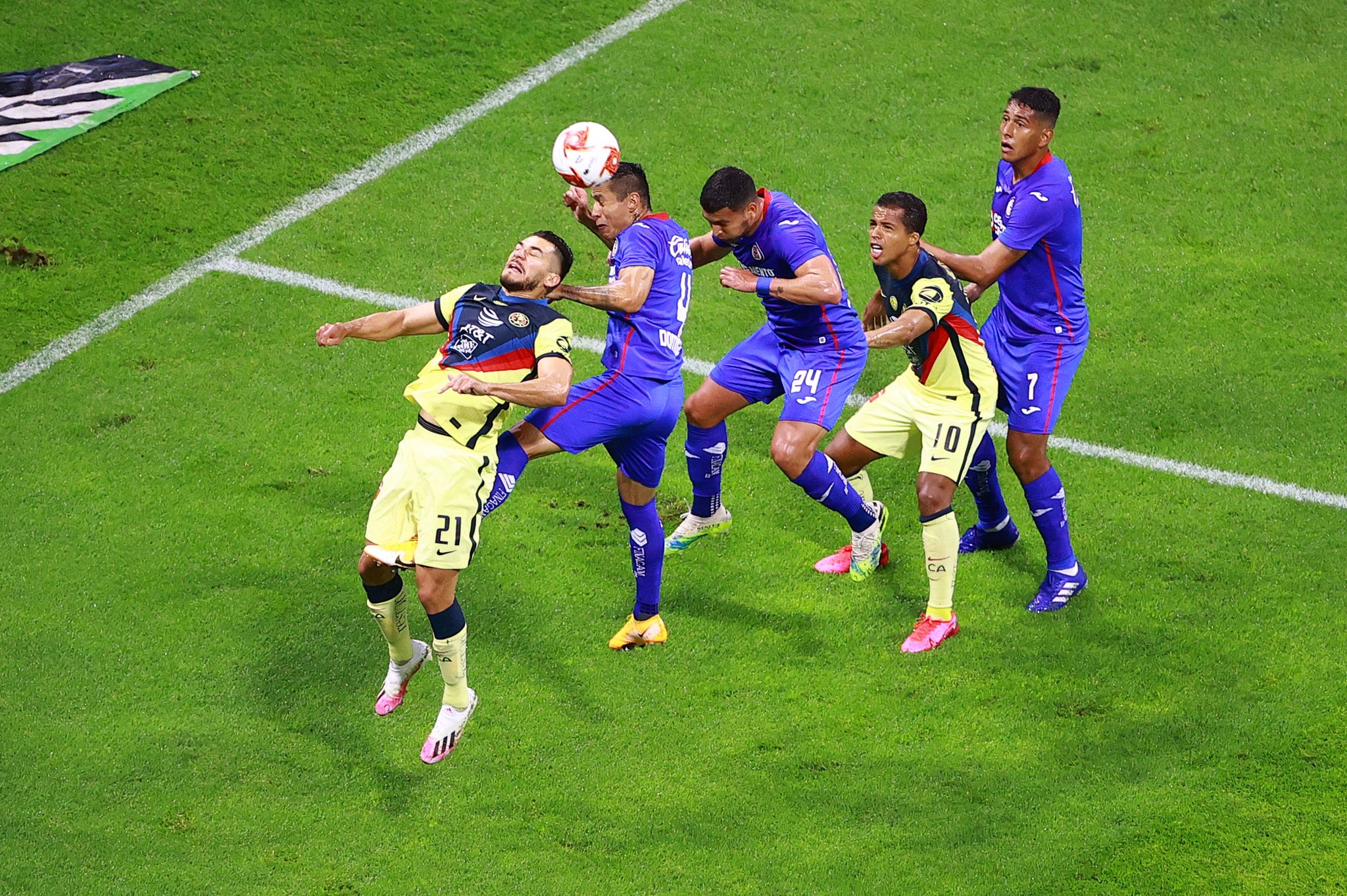 Eso sí, América ejerció un breve dominio en los primeros minutos del juego al explotar la banda izquierda con Giovani dos Santos; en su primera descolgada encontró a Sebastián Córdova, quien mandó su disparo a la tribuna, mientras que en la segunda sacó un centro medido para Henry Martín, pero cuyo remate –que ya había atajado Corona– fue invalidado por fuera de lugar.