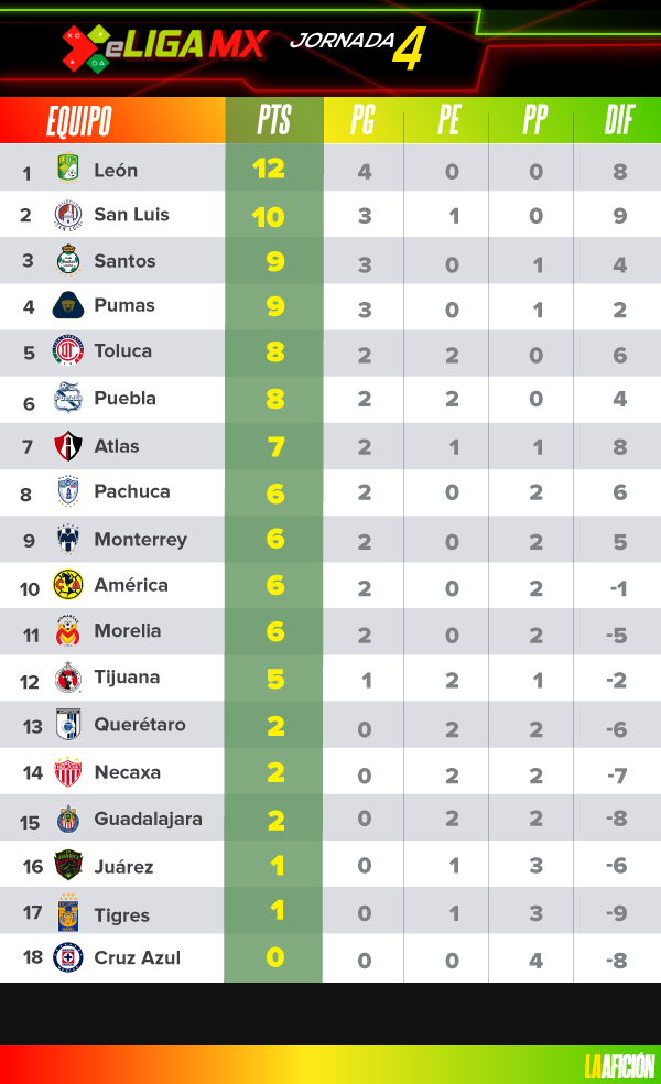 Culminó la cuarta jornada del torneo en la eLiga MX, mismo en donde el León se erige como el mejor equipo de la competencia al sumar los 12 puntos que se han disputado hasta el momento.
