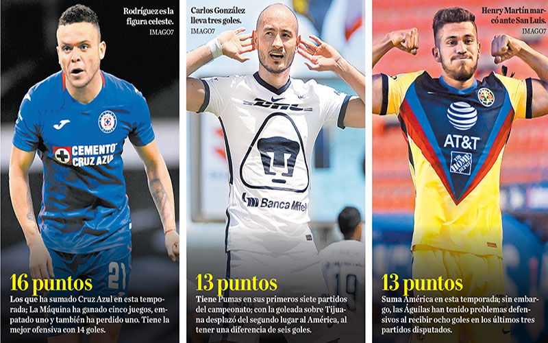 De esta manera, Cruz Azul con 16 puntos, Pumas y América con 13 unidades encabezan el torneo y ocupan tres de las cuatro plazas que dan un boleto directo a la Liguilla. El dominio de los tres capitalinos es contundente, al combinarse para 12 triunfos, seis empates y solo tres derrotas.
