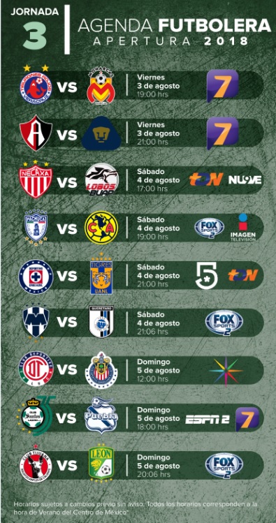 Este viernes arranca la jornada 3 de la Liga MX en el torneo Apertura 2018, y sabemos que no quieres perderte ningún partido. Por ello, aquí te traemos las fechas, horarios y dónde ver los nueve encuentros de este fin de semana.