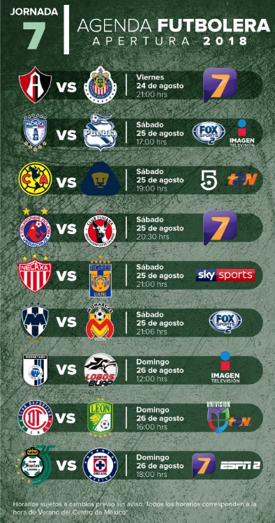 Para que no te pierdas ningún partido de la Liga MX, te dejamos las fechas, horarios y canales donde ver los nueve partidos de la jornada 7 del Apertura 2018.