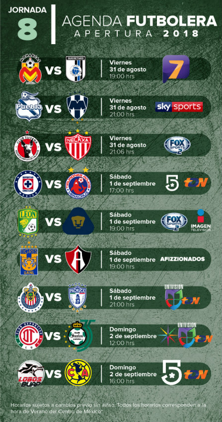 Para que no te pierdas ningún partido de la Liga MX, te dejamos las fechas, horarios y canales donde ver los nueve partidos de la jornada 8 del Apertura 2018.