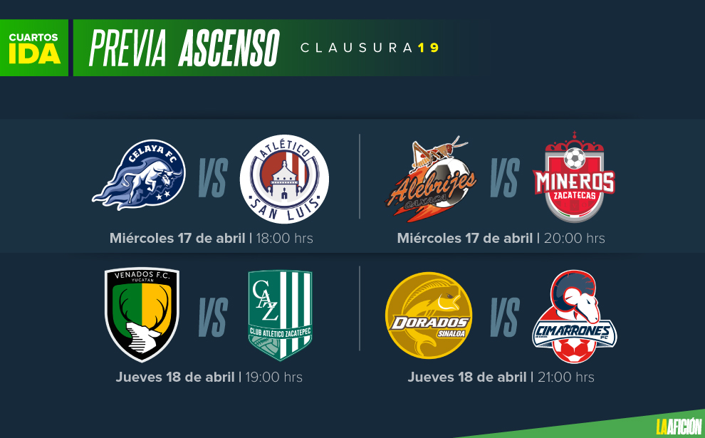 El jueves, Venados de Mérida recibe a Club Atlético Zacatepec en el Carlos Iturralde Rivero; mientras que el choque entre Dorados de Sinaloa y Cimarrones de Sonora en el Estadio Banorte cierra la actividad de los partidos de ida.