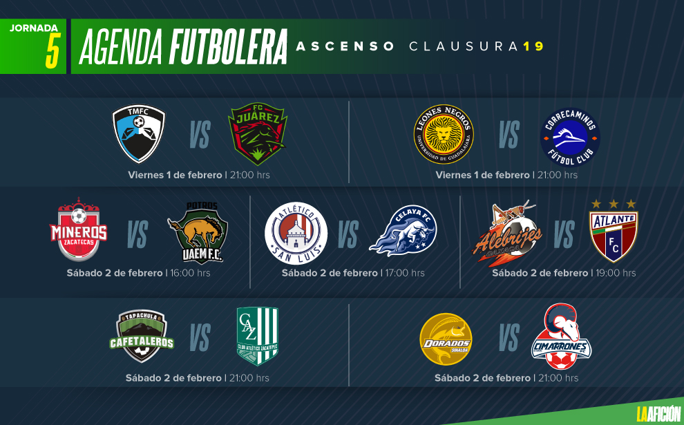 Este fin de semana arranca la jornada 5 del Ascenso MX en el torneo Clausura 2019, por lo que te traemos los partidos, fechas y horarios para que no pierdas detalle de ningún encuentro.