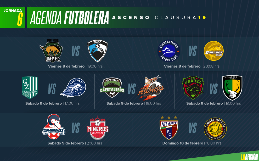 Este fin de semana arranca la jornada 6 del Ascenso MX en el torneo Clausura 2019, por lo que te traemos los partidos, fechas y horarios para que no pierdas detalle de ningún encuentro.