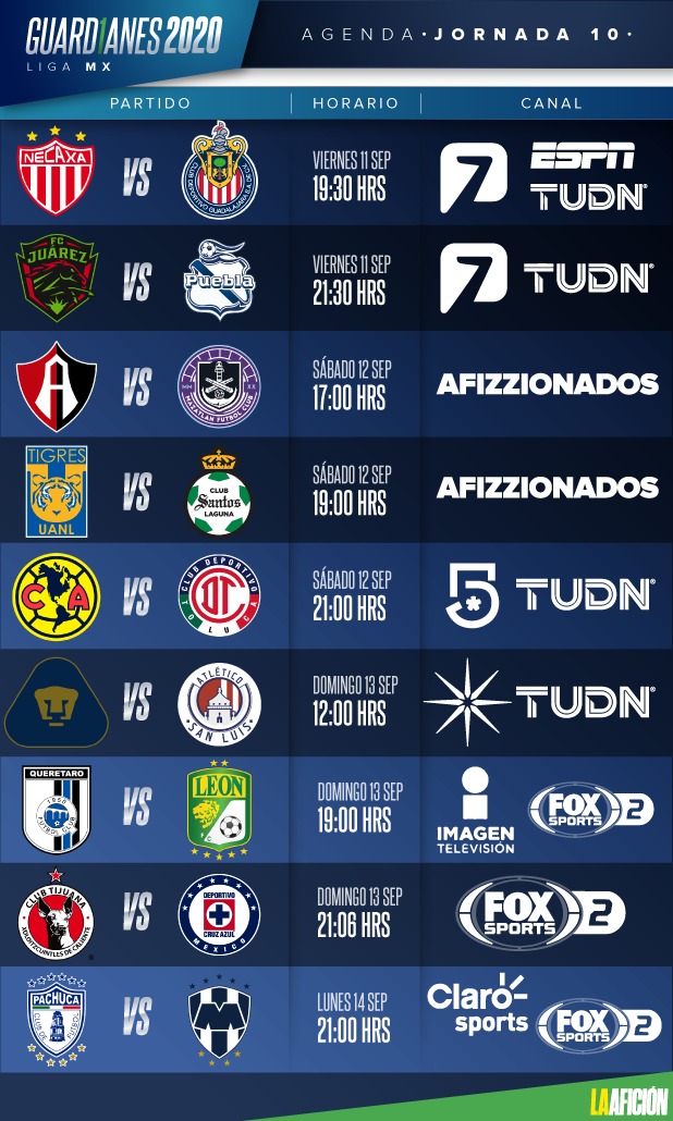 Entre dichos duelos, también se disputará el Querétaro vs León, sin embargo, no dará cierre a esta fecha, el juego que finalizará todas las acciones de la jornada 10 será el lunes, cuando Pachuca reciba a Monterrey.