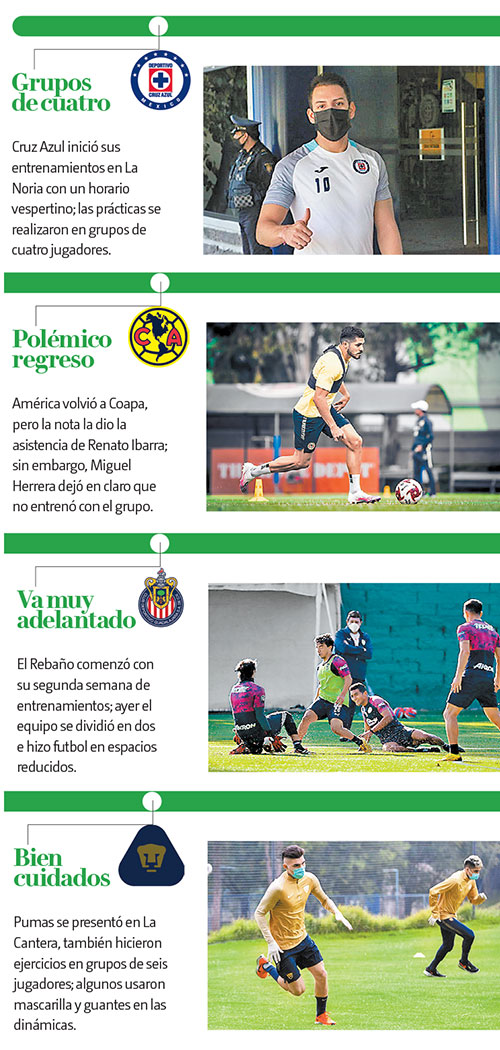 En estos momentos son 15 los equipos que ya están realizando entrenamientos en campo. Chivas, Monterrey y León comenzaron desde la semana pasada a entrenar en sus instalaciones, mientras que 12 más iniciaron ayer, y los tres restantes lo harán en los próximos días. Atlas, Juárez y Querétaro apenas están realizando sus pruebas médicas, requisito indispensable que exige la Liga Mx para avanzar con cada una de las cuatro etapas que marca el protocolo sanitario.