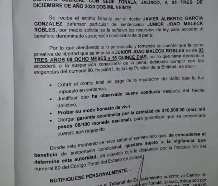 Una vez reparado el daño, el abogado de Joao Maleck, Javier Alberto García González, solicitó formalmente la suspensión condicional de la pena para que el jugador del Club Santos Laguna obtenga su libertad.