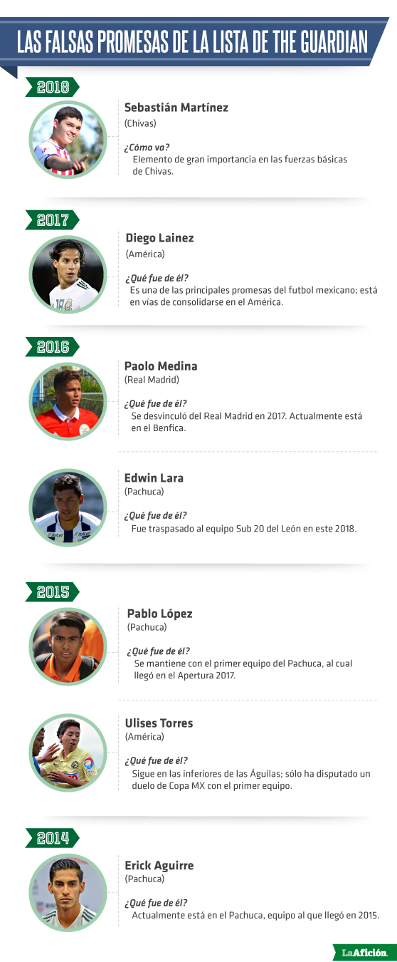 Cada vez que llega la segunda semana del mes de octubre, el periódico inglés da a conocer esta lista. En los cuatro años en los que se ha efectuado este ejercicio, un total de siete jugadores mexicanos han aparecido en este; el más último ha sido Sebastian Martínez, en la edición de este 2018.