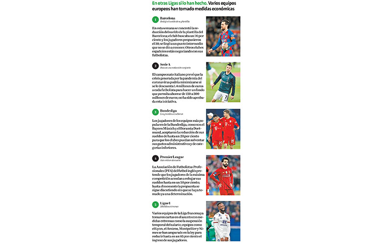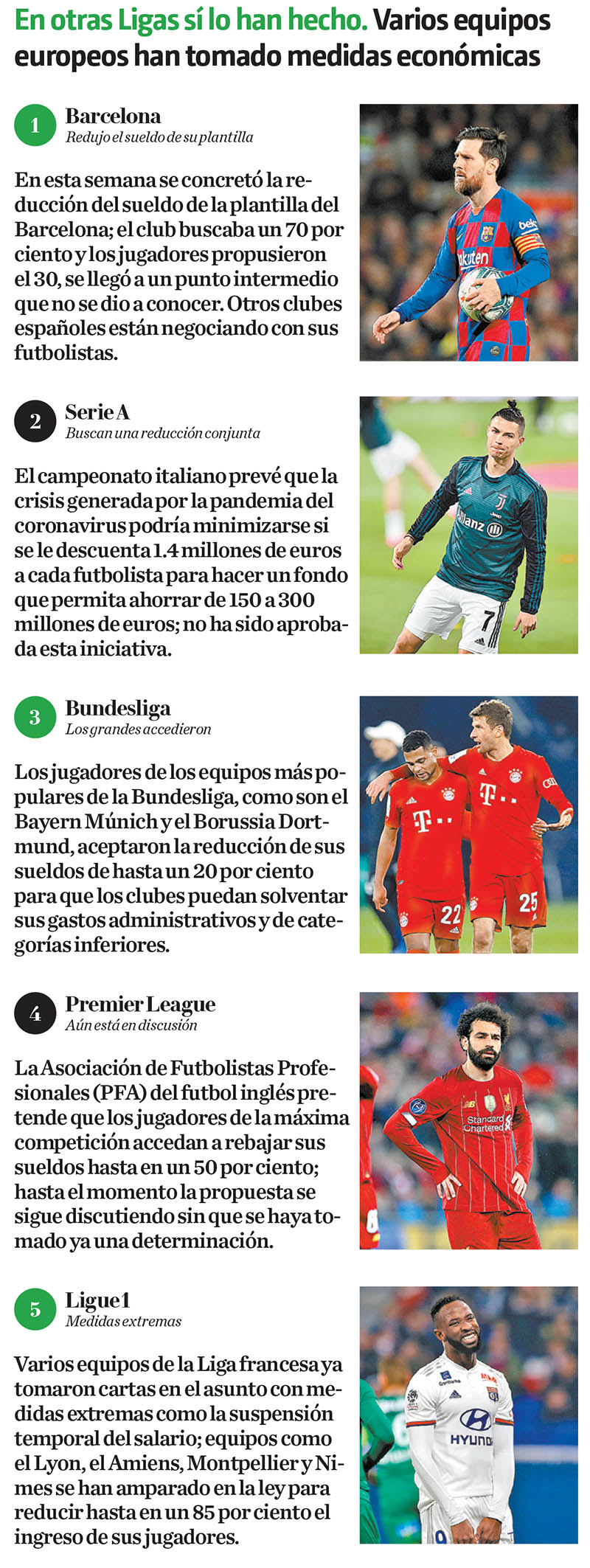 Y es que este debate no concierne solamente a la Liga Mx, sino a todo el futbol mundial; clubes de la talla del Barcelona, Bayern Múnich, Borussia Dortmund, entre otros, ya han realizado la reducción de los salarios de sus plantillas estelares para equilibrar sus gastos, pues con la pausa que ha provocado la pandemia del coronavirus el balompié se ha quedado sin ingresos.