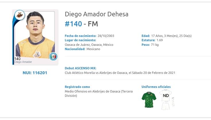 Fue al minuto 88 del partido entre Morelia y Alebrijes de Oaxaca, cuando el conjunto oaxaqueño mandó al canterano de 17 años a la cancha. Diego Amador es el tercer debut de su equipo en este Guard1anes 2021 y el treceavo, contabilizando los del torneo pasado.