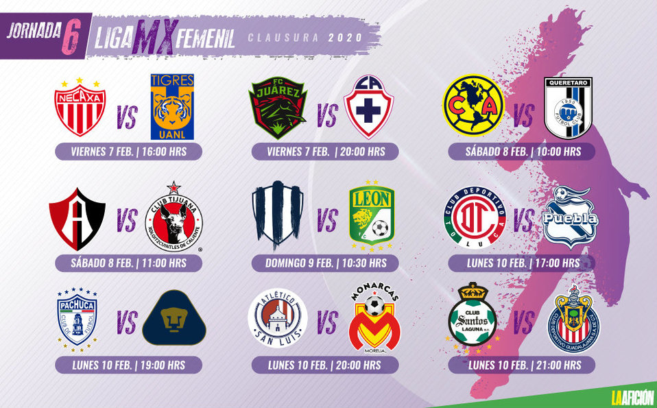 Este viernes 7 de febrero a las 16:00 horas arrancará la jornada 6 con el duelo entre Necaxa y Tigres en el Estadio Victoria, para el día sábado tendremos interesantes duelos como el América vs Querétaro y el de las líderes Atlas ante Tijuana a las 10:00 y 11:00 horas respectivamente.