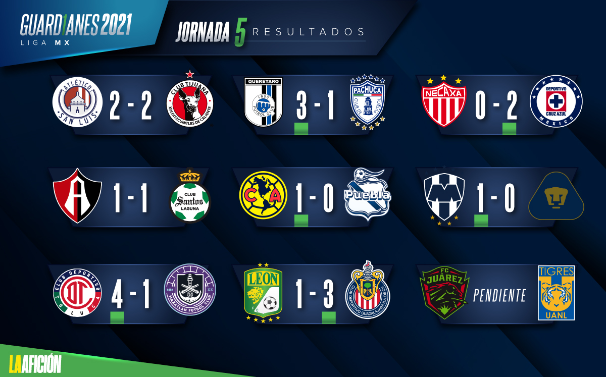 Por su parte, Toluca ocupa el liderato con 10 unidades luego de vencer por 4-1 a Mazatlán en el Nemesio Diez, seguido por Monterrey que superó por la mínima ventaja a Pumas.
