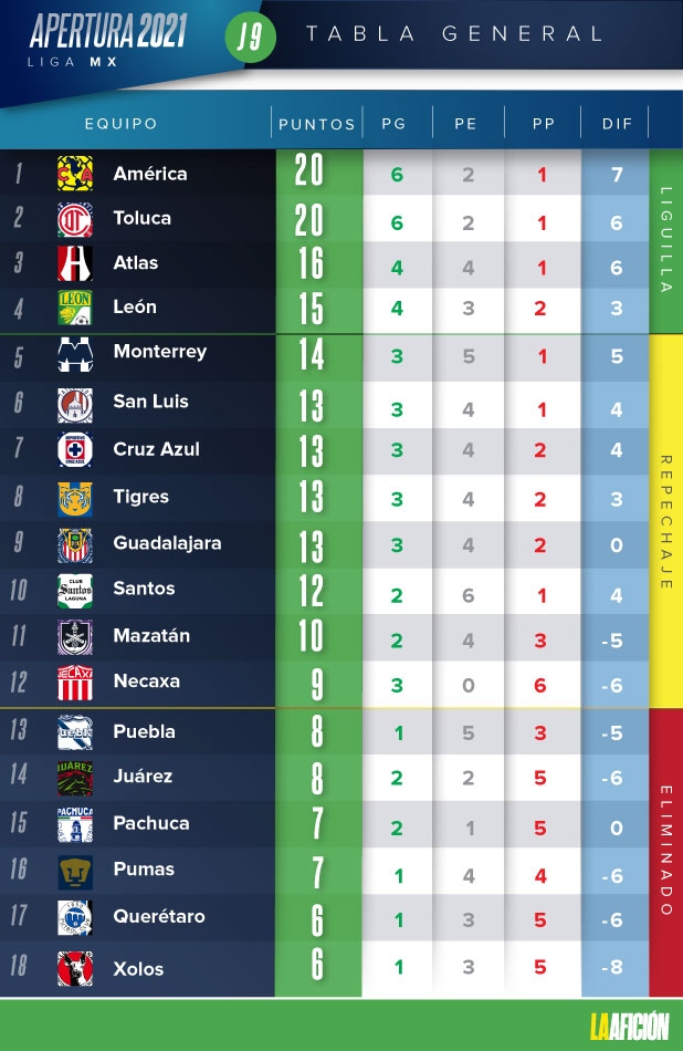 Tabla general tras la jornada 9 de la Liga MX