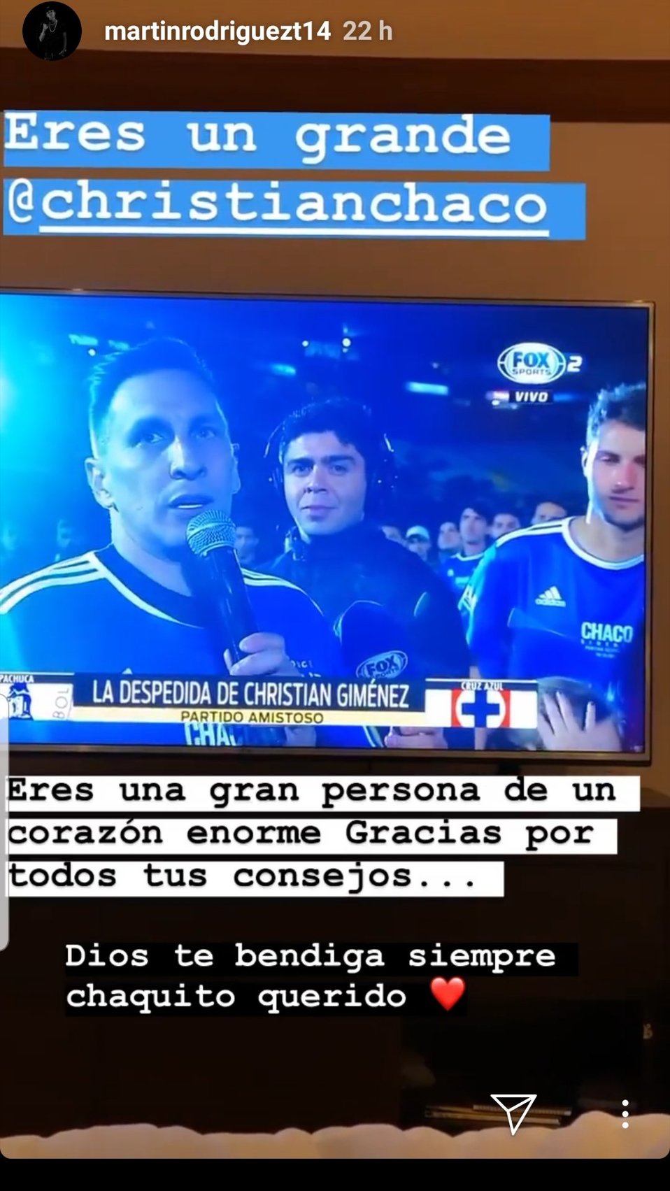 "Eres un grande @christianchaco. Eres una gran persona de un corazón enorme. Gracias por todos tus consejos... Dios te bendiga siempre Chaquito querido", fue la publicación que compartió Rodríguez en sus historias de Instagram.