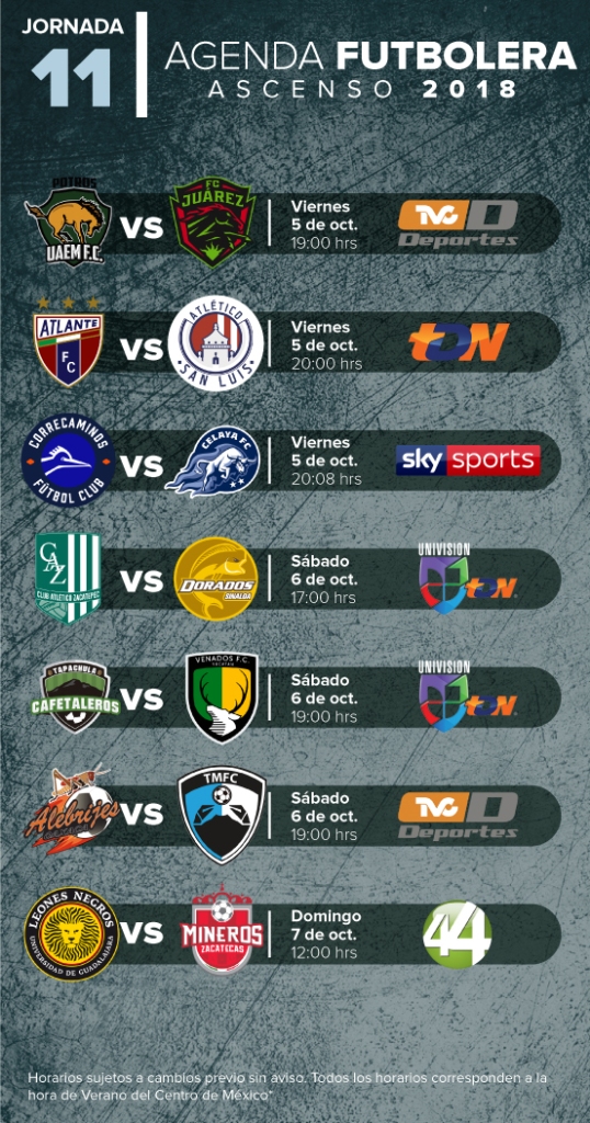 Este viernes 5 de octubre arranca la décima primera jornada del Ascenso MX, cla cual marca la recta final del certamen regular correspondiente al Apertura 2018, por lo que la lucha por puestos de liguilla se intensifica conforme se acerca la última fecha.
