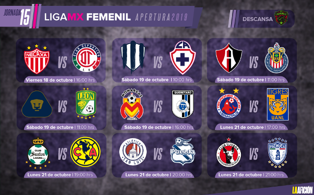La fecha 15 del torneo Apertura 2019 en la Liga MX Femenil ha llegado, en donde varios equipos ya se perfilan como candidatos al título y otros se mantienen en la pelea por meterse en zona de clasificación de cara a la Liguilla.