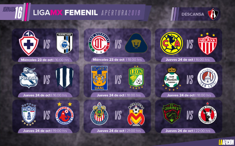La Fecha 16 del torneo Apertura 2019 en la Liga MX Femenil ha llegado y a falta de tres jornadas, la carrera por puestos de liguilla se intensifica. Por ello, aquí te dejamos todo lo que necesitas saber para no perderte detalle de tu equipo.