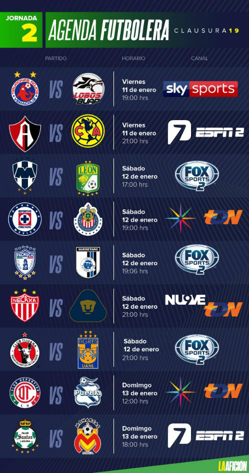 No te pierdas ningún partido de la jornada 2 con las fechas, horarios y dónde ver los canales de transmisión de la Liga MX en el torneo Clausura 2019.