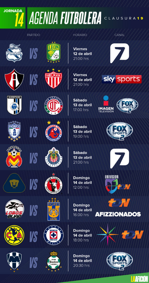 Este viernes 12 de marzo arranca una nueva jornada en la Liga MX, por lo que te dejamos las fechas, horarios y dónde ver los canales de transmisión de los partidos de la Jornada 14 del Clausura 2019.