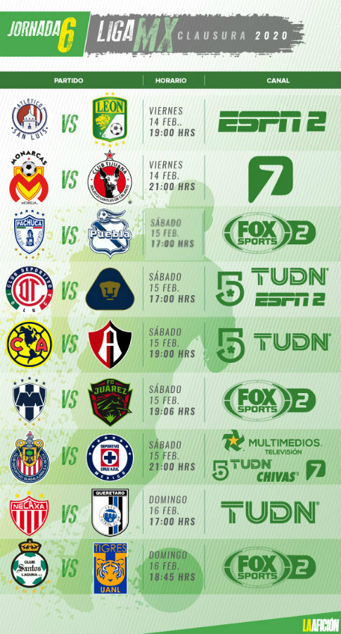 Este viernes 14 de febrero comienza la Jornada 6 del Clausura 2020 en la Liga MX, por lo que aquí te dejamos todo lo que necesitas saber para no perderte detalle de tu equipo favorito.