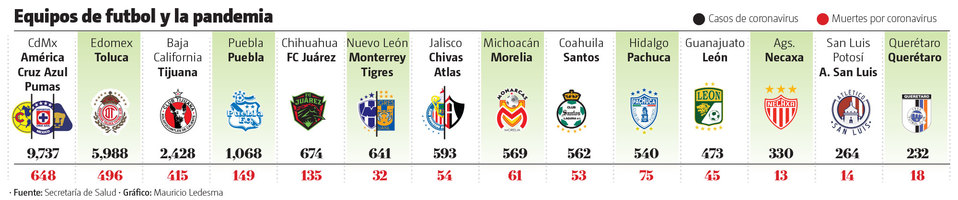 Por otro lado, el Estado de Querétaro, sede de los Gallos Blancos, es el que menos casos registra, con 232 y 18 defunciones. Mientras el estado de Aguascalientes, sede del Necaxa, es el que contabiliza el menor número de defunciones con 13 y 330 casos positivos.