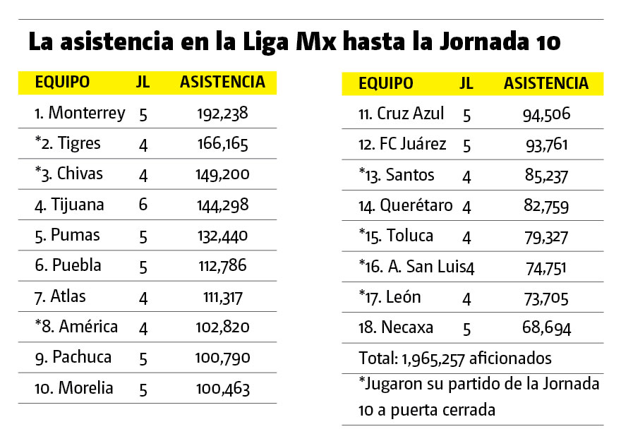 El poder de convocatoria del futbol, no está en tela de juicio, hasta la jornada 10 en los estadios se registró una afluencia de un millón 965 mil 257 aficionados según datos de la Liga MX. Siendo Monterrey (Nuevo León) el equipo que más seguidores ha tenido con 192 mil 238 en cinco partidos que ha jugado como local. Y Necaxa (Aguascalientes) es el conjunto que menos gente ha llevado a su estadio, con 68 mil 694 aficionados en cinco partidos disputados en el estadio Victoria.