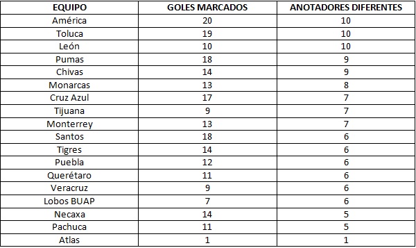 Por otra parte, Cruz Azul, el actual líder del certamen, igualmente ha encontrado una variedad en sus armas para el gol, sin embargo no lo han logrado las Águilas, los Diablos y los Esmeraldas.