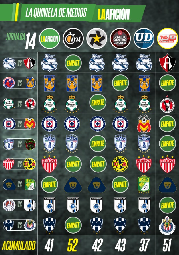 Entramos a la recta final del Apertura 2019 en la Liga MX y, en nuestra Quiniela La Afición, Mediotiempo y TVC Deportes no cesan en su lucha en lo más alto de la tabla, al registrar 52 y 51 puntos respectivamente, siendo -de manera real- los únicos que aspiran al título.