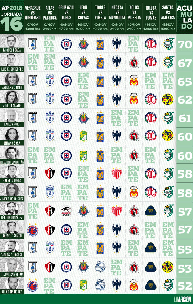 Después de un mal torneo para Héctor González –ganador de la edición pasada- Miguel Boada mantendrá la ventaja pase lo que pase respecto a Luis Enrique Gutiérrez de acuerdo a sus pronósticos en esta semana, aunque Azucena Uresti, tercer lugar de la competencia, podría darle alcance ya que muestra una quiniela muy distinta a la del líder.