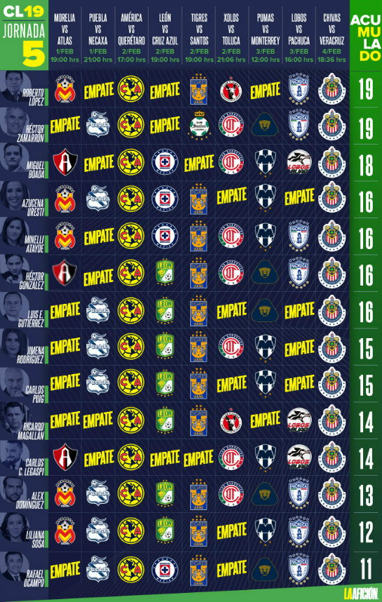Sin embargo, quien se llevó los reflectores en la Jornada 4 fue Azucena Uresti, al acertar en siete de los nueve resultados, lo que le permitió llegar a 16 unidades, pasando del penúltimo sitio hasta el cuarto peldaño general, a tan sólo tres unidades de los punteros.
